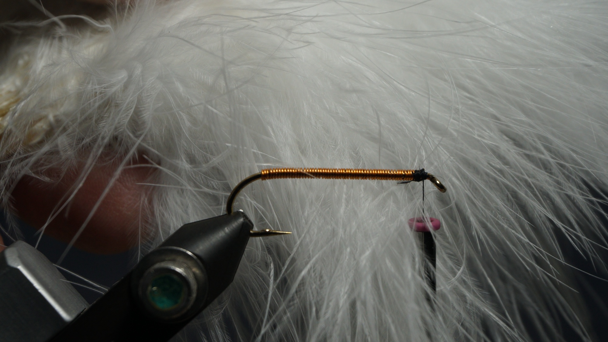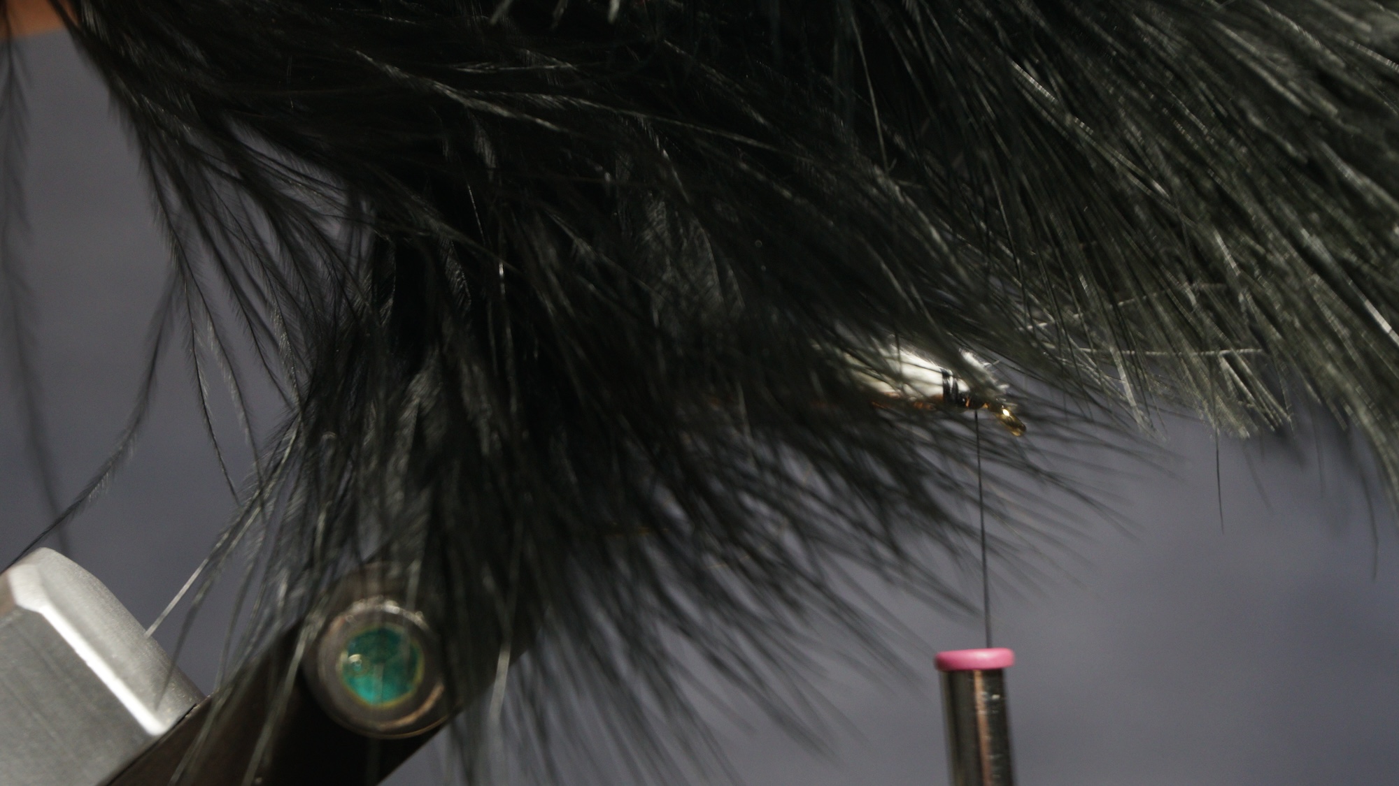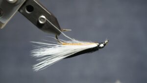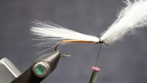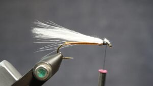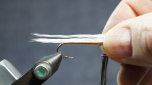 Measure a clump of white or light marabou 1.5 hook length; wet marabou to make management easier; tie in an eye length behind eye; clip extra at an angle