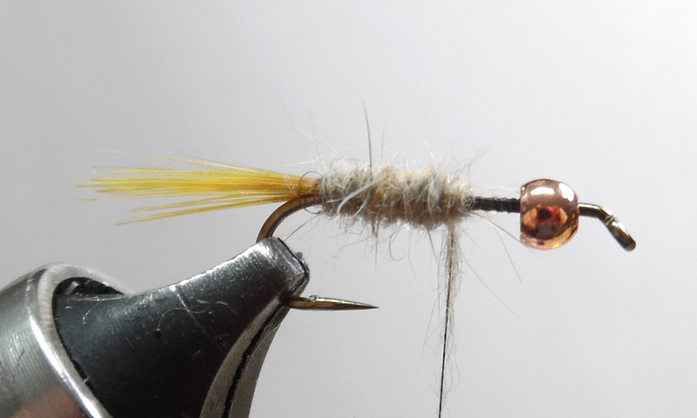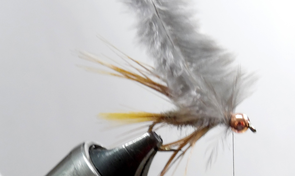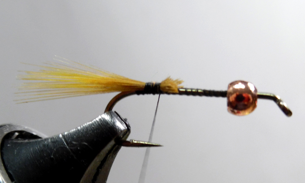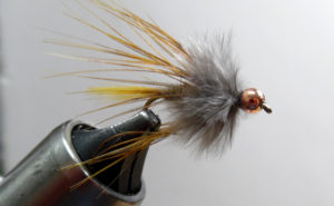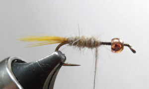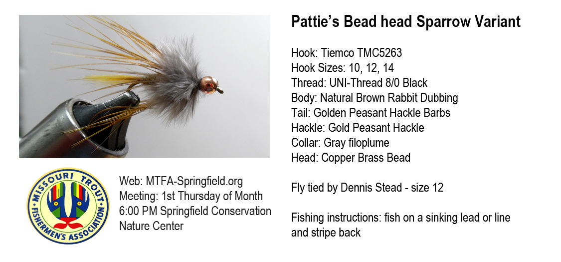 Pattie Hayes a MTFA member has been tying flies for a long time. Every MTFA meeting, she is tying Flies. Every fly tying event, at the Nature Center, Bass Pro Shop or where ever there is a table, she is tying flies. Pattie gave me this fly at one of our fly tying events. She called it a variation of the Gray Sparrow. I have searched the internet for all variation of the Sparrow, and non look like this. So that is why I am give it a name – the Pattie’s Bead Head Sparrow Variant.