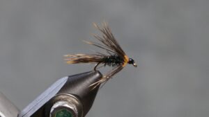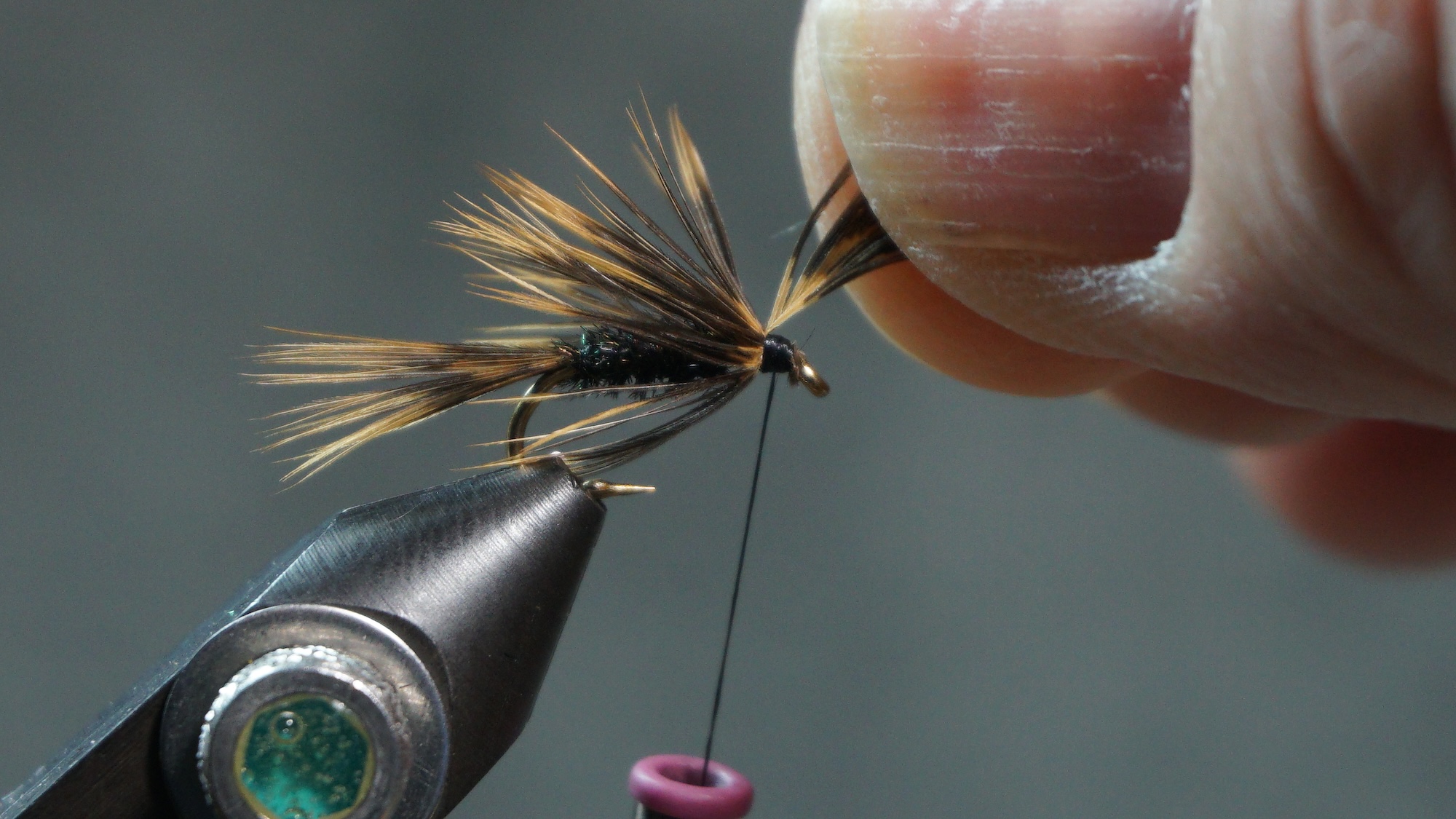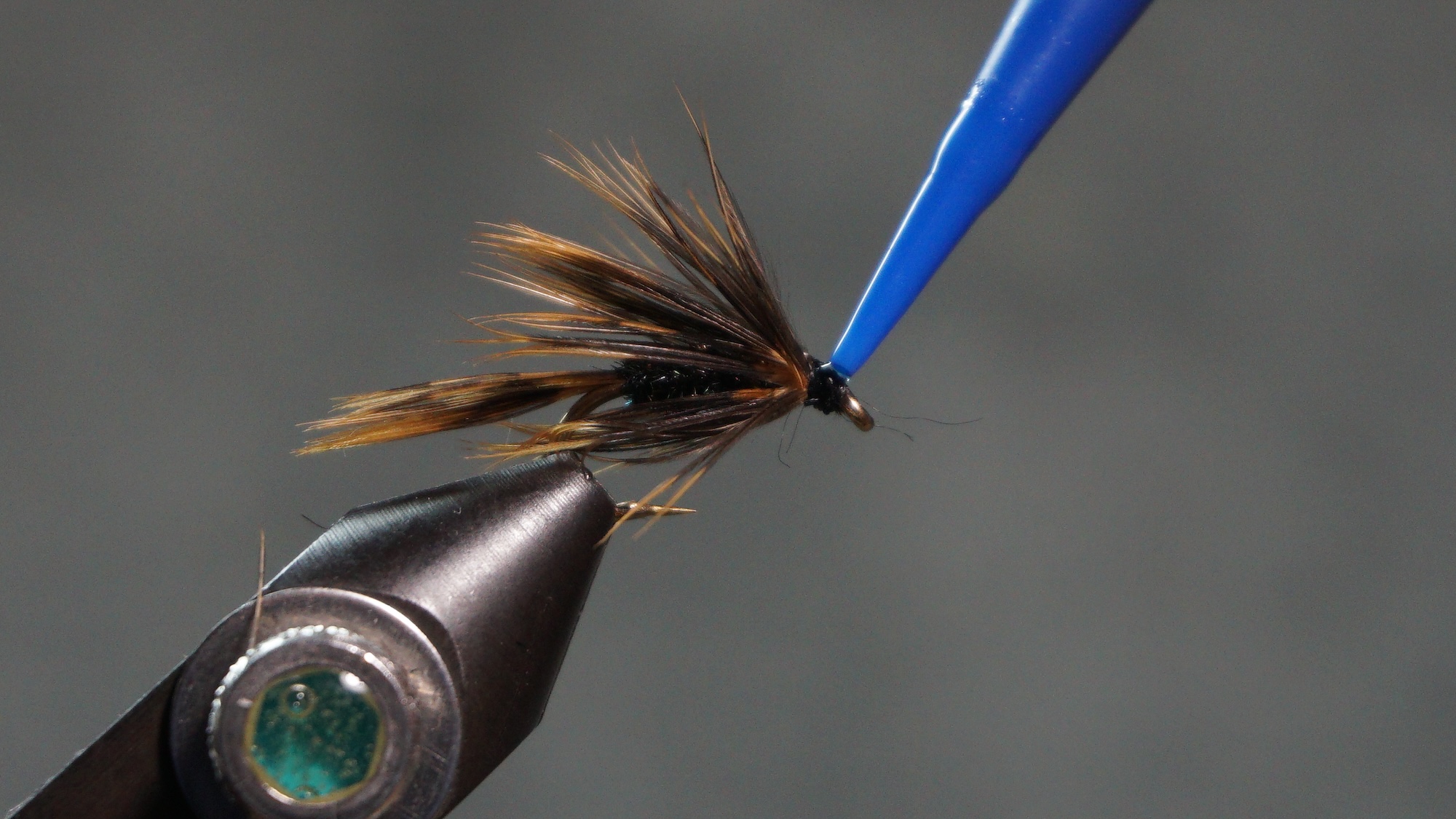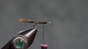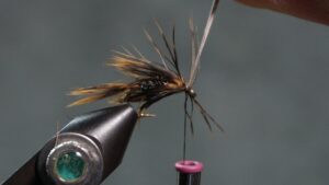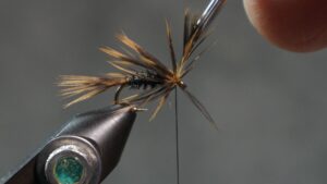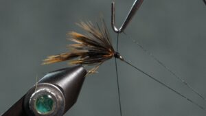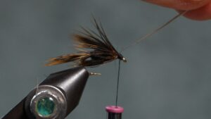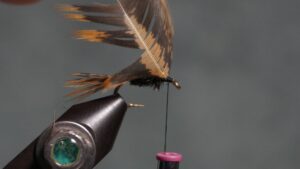 Tie in the soft wet fly hackle an eye length behind the hook eye; wrap a sparse front hackle; tie off and clip