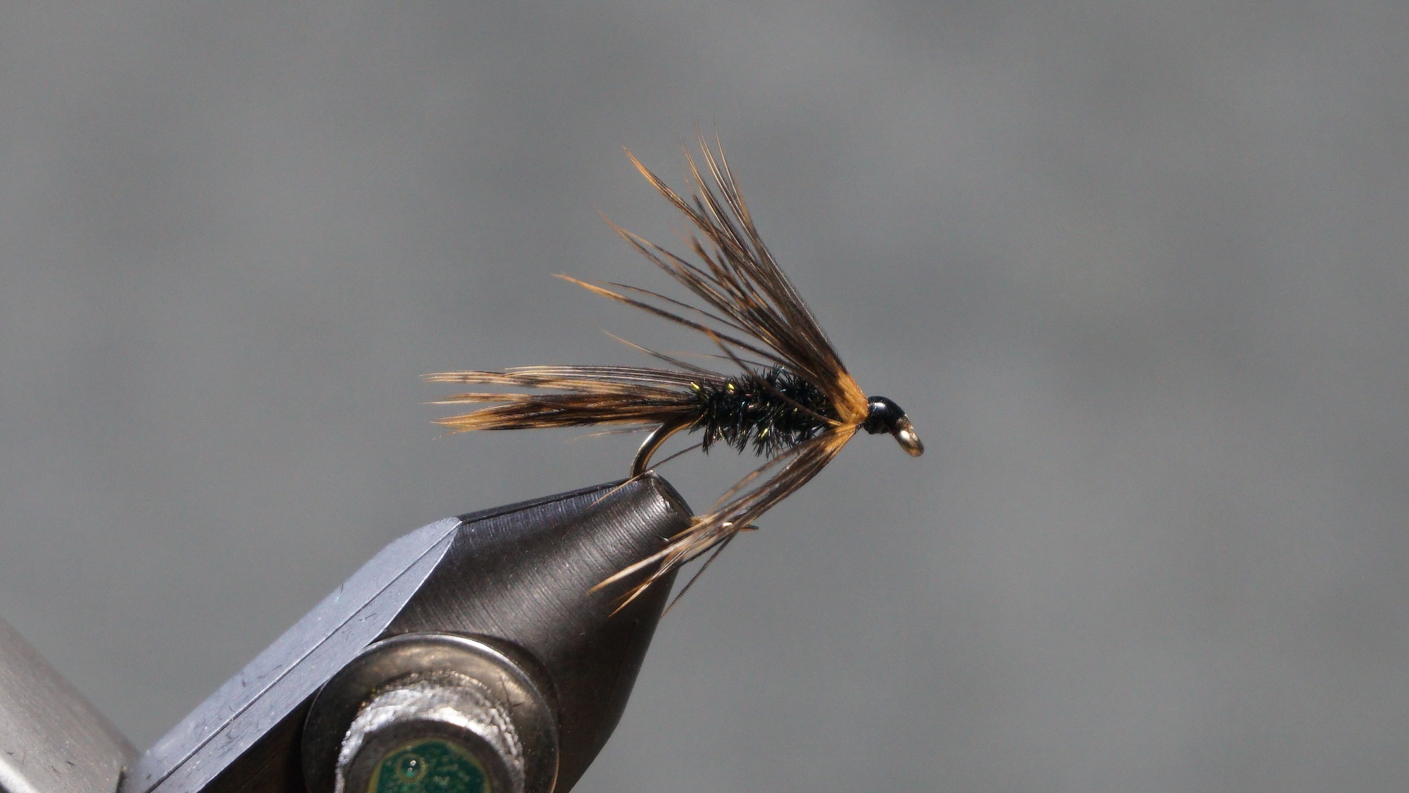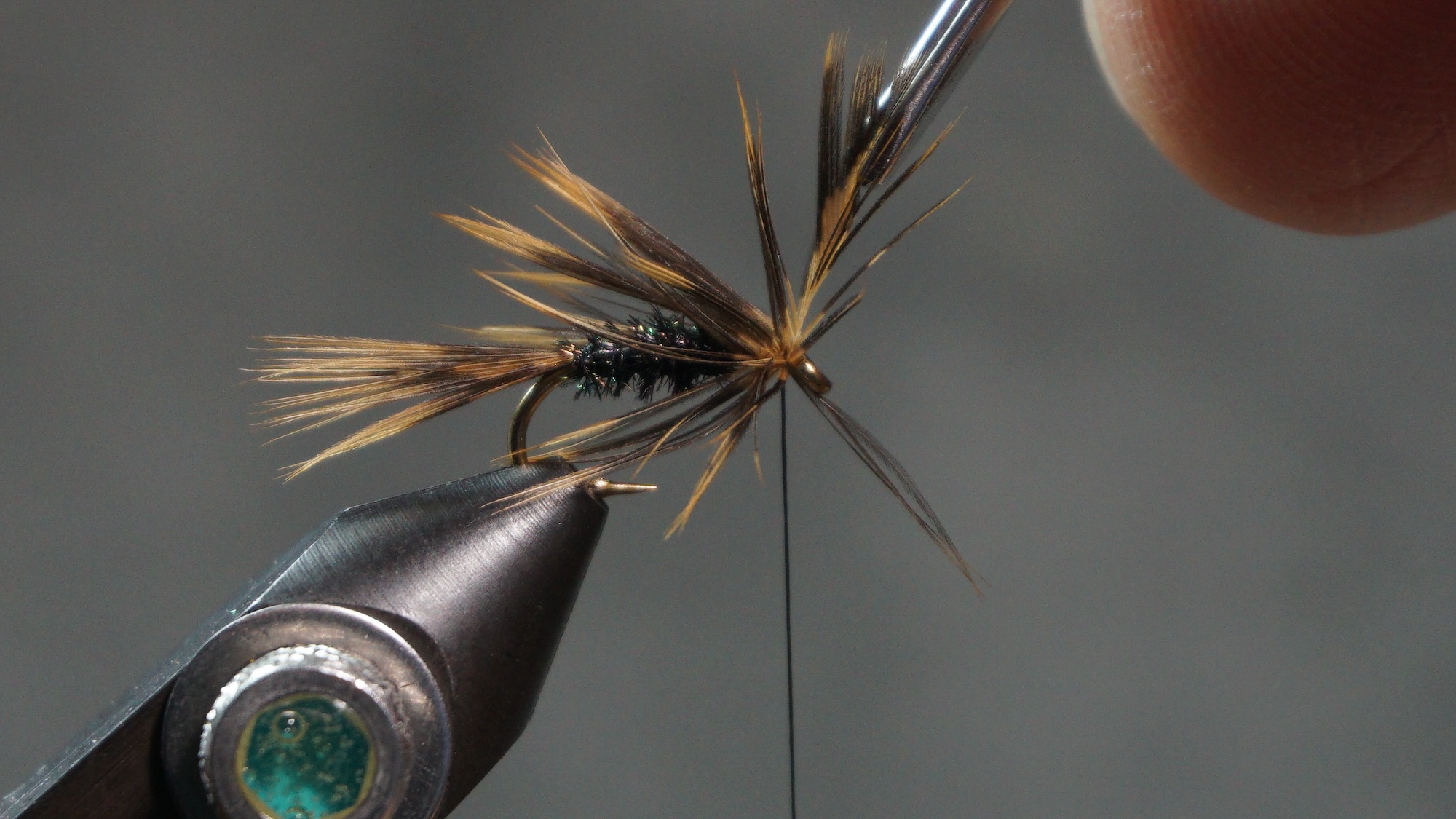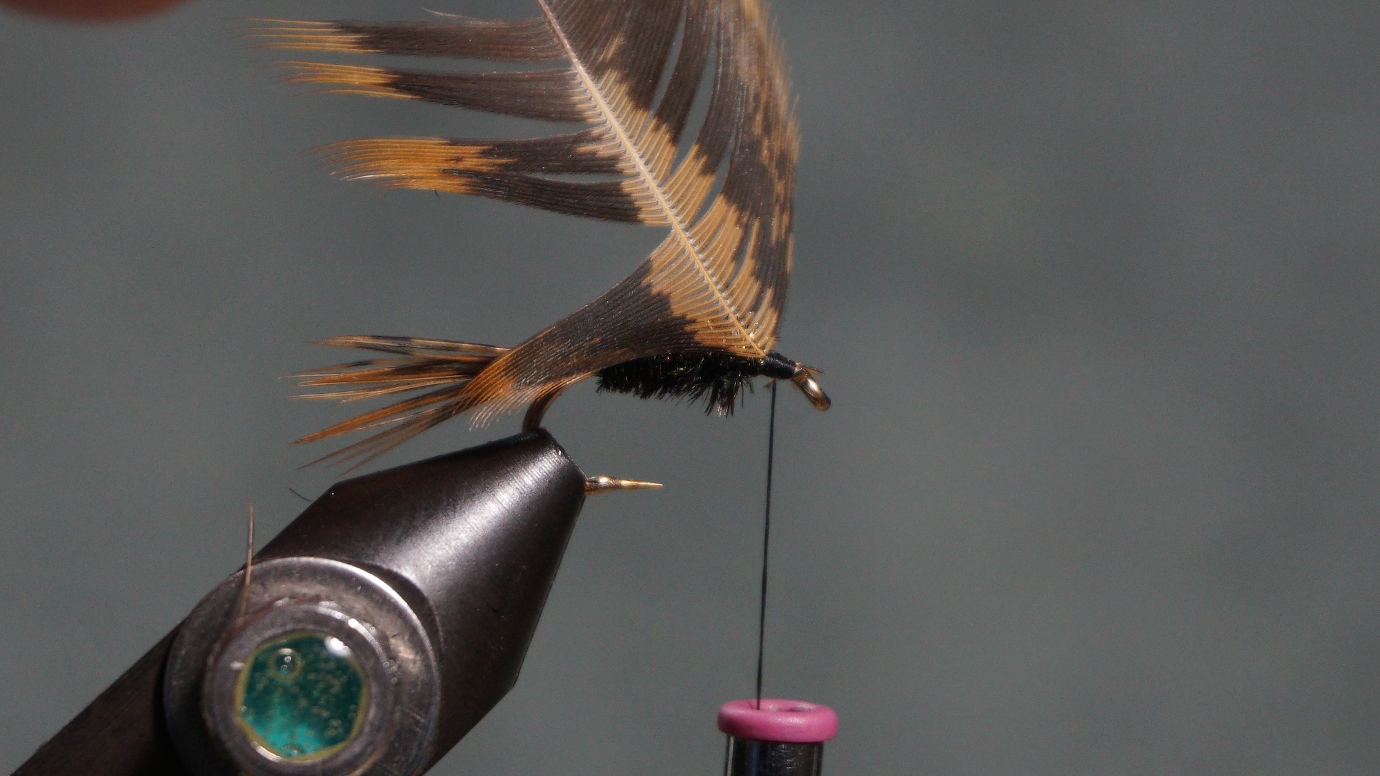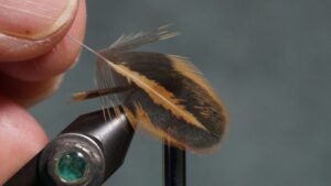 Method 1 to tie in soft hackle: separate the tip of the feather and pull back the rest of the feather fibers; tie the feather in by the tip (clip tip either before or after tying in); wrap the feather by the stem with hackle pliers; catch in the stem; pull back on all the fibers; wrap head; clip or pull off stem.