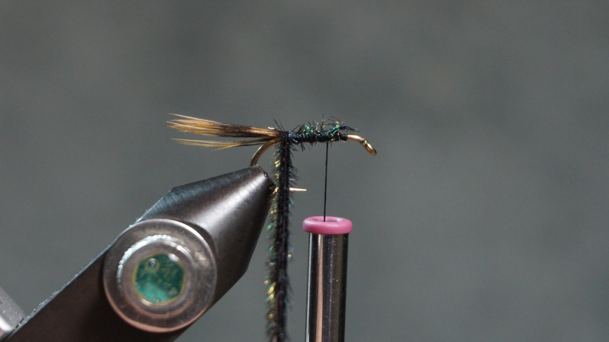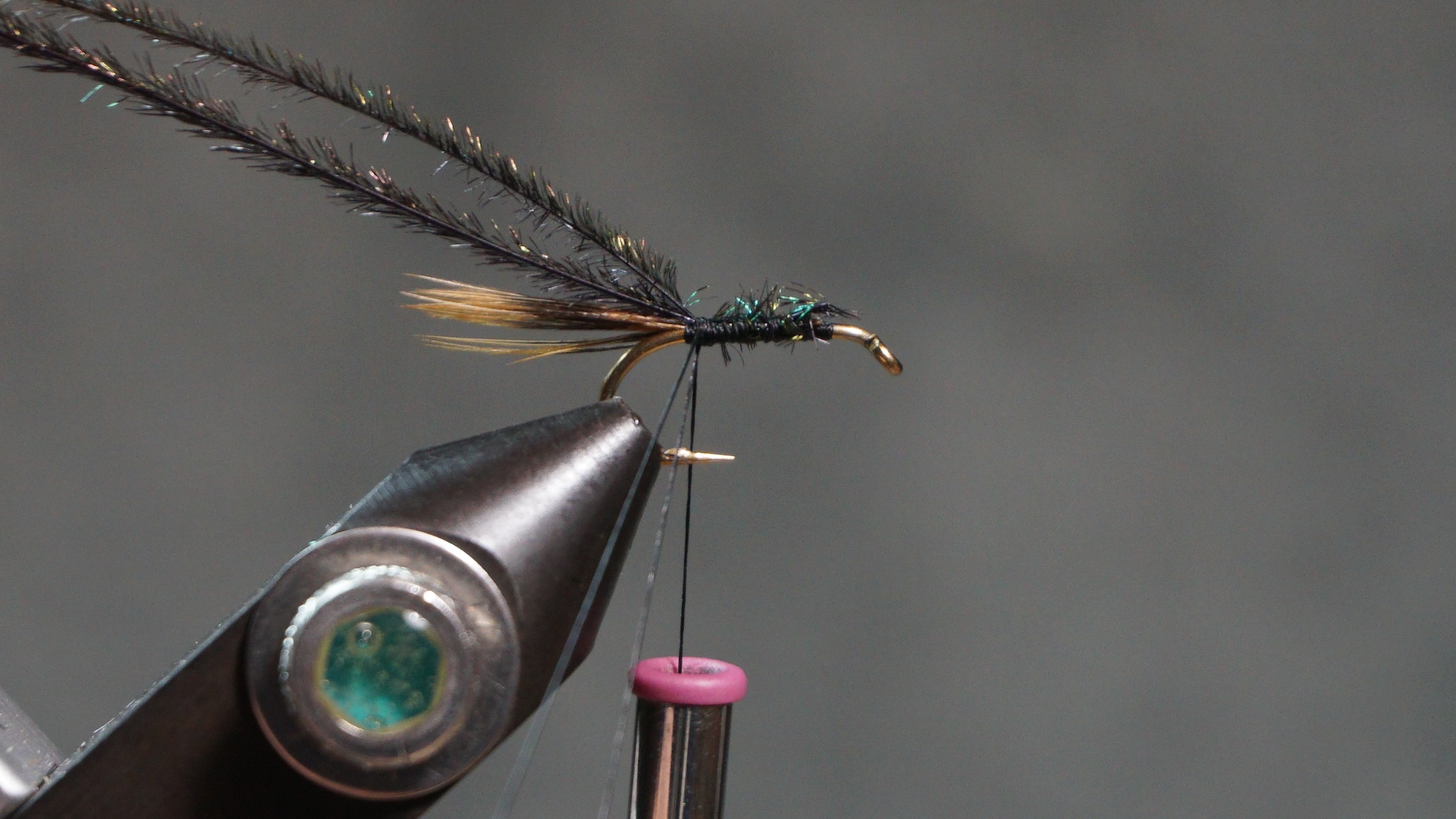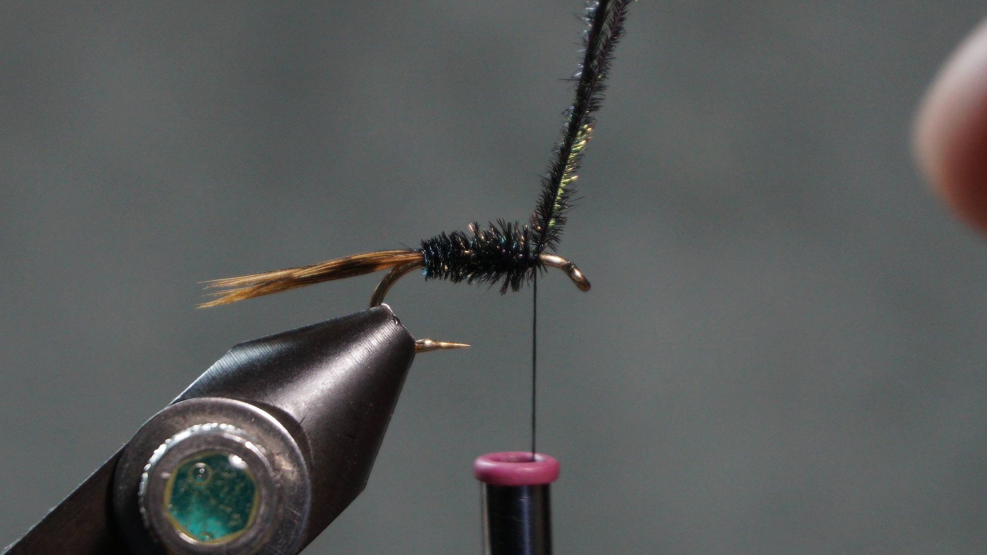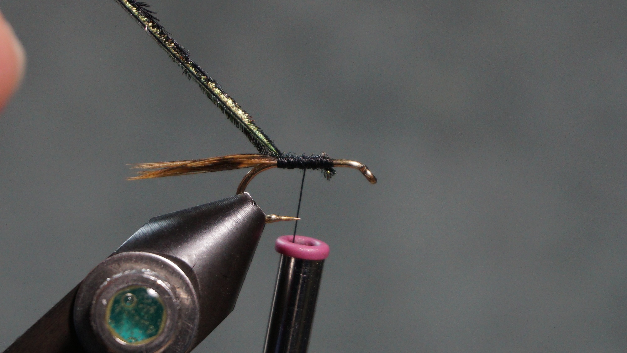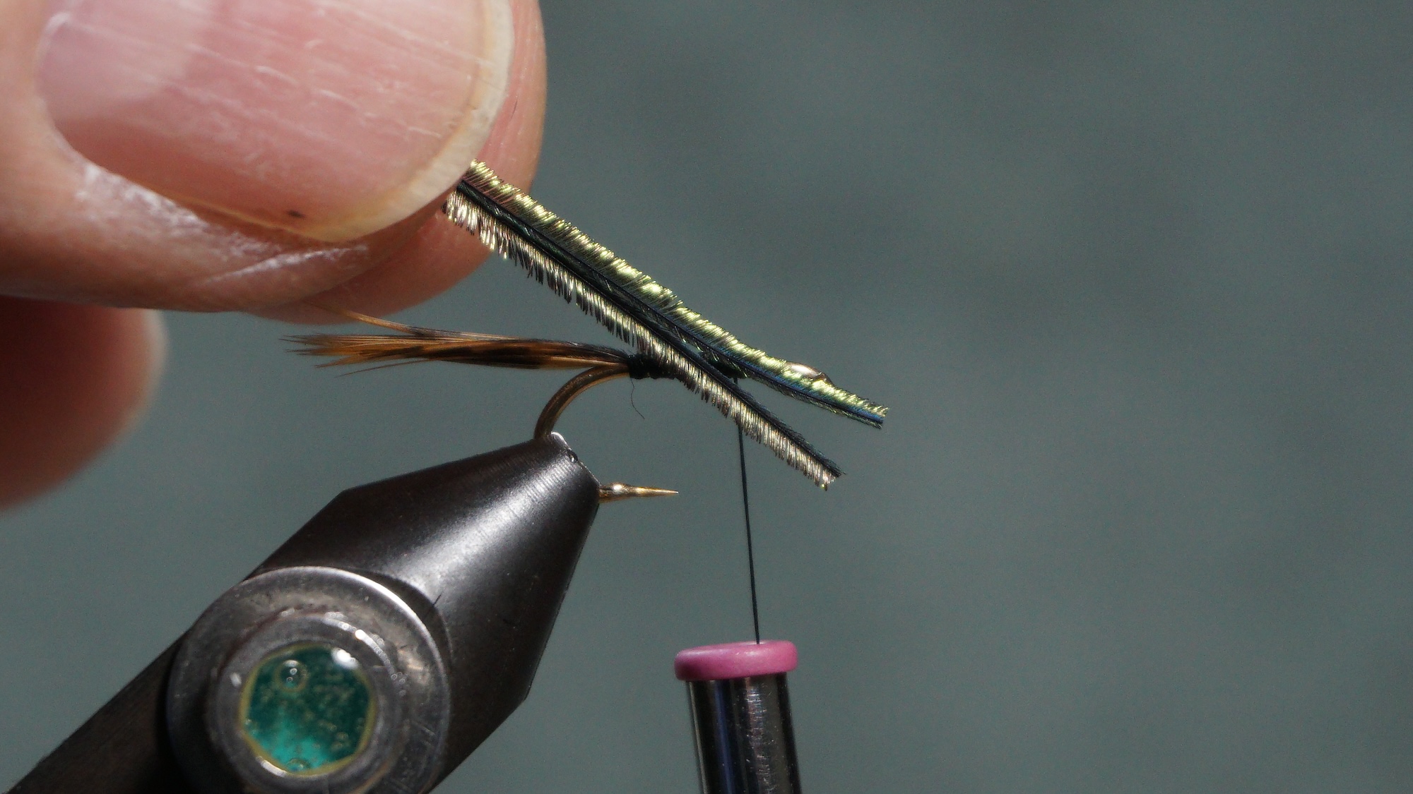 Tie in two Peacock herl wrapping to the tail
