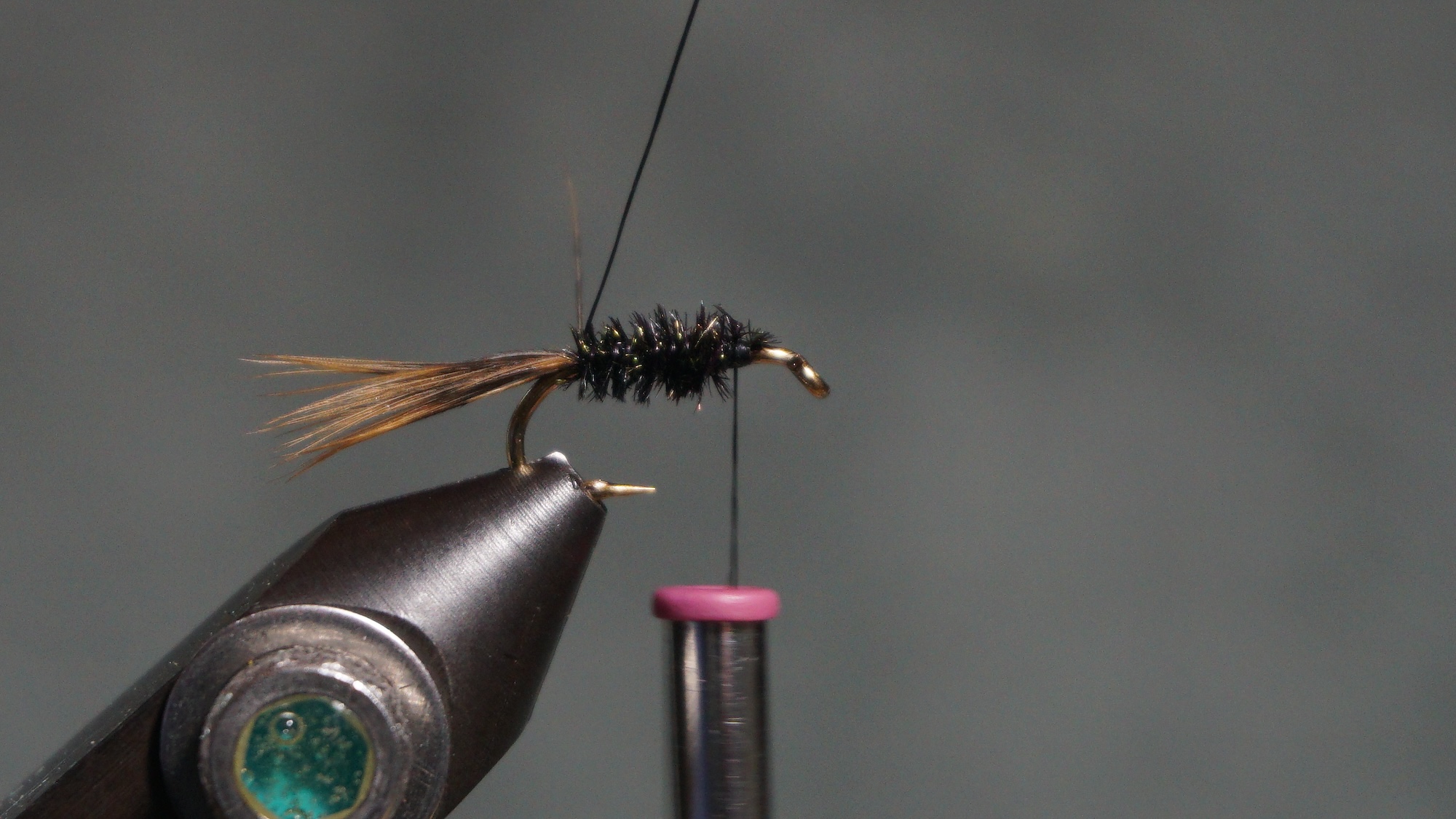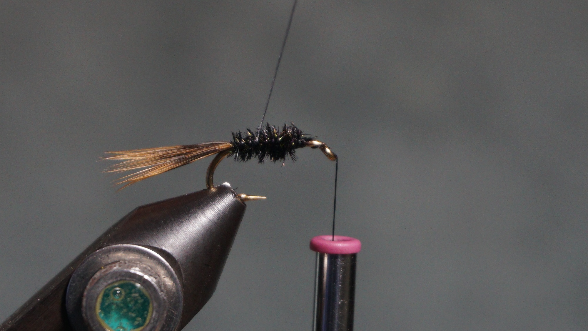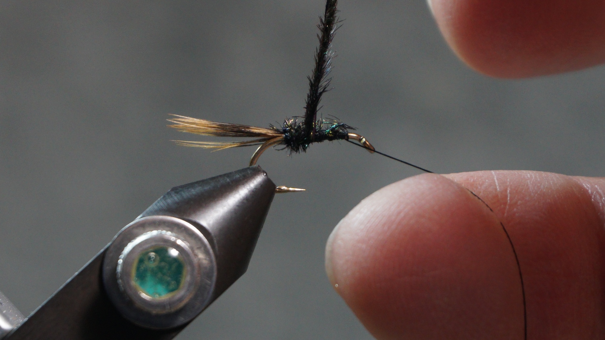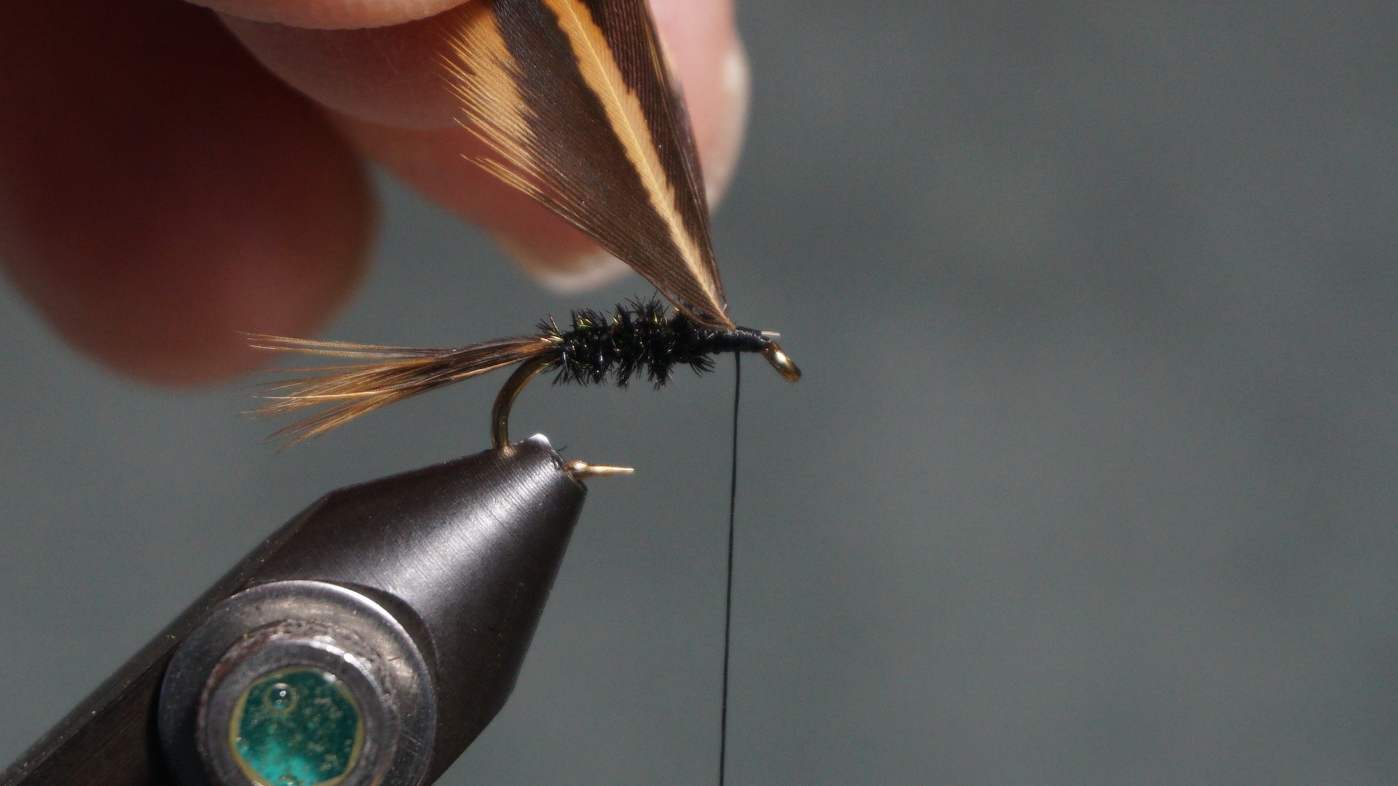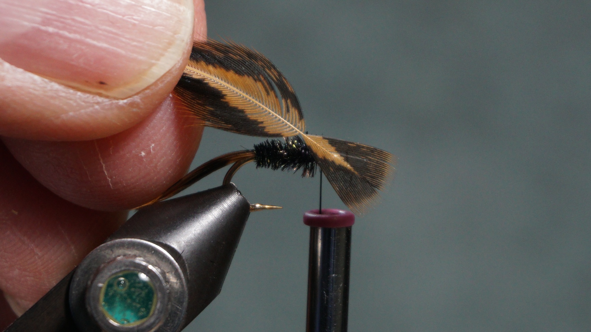 Tie in two Peacock herl wrapping to the tail