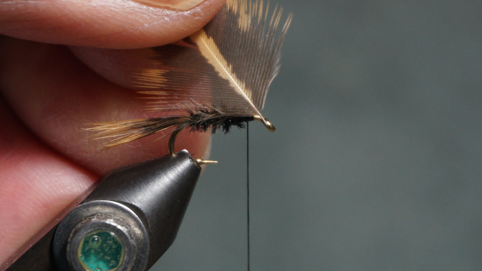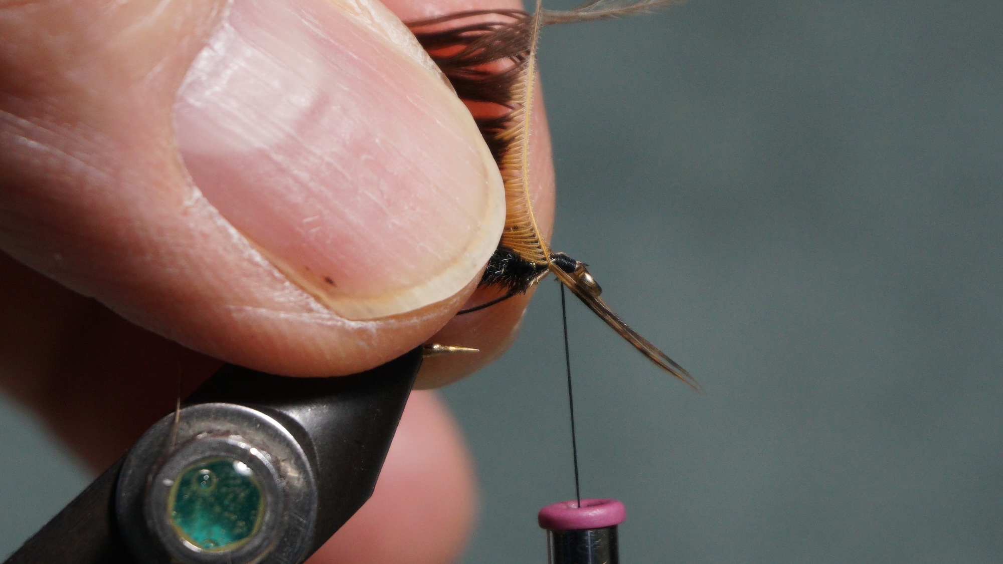 Method 2 to tie in soft hackle: clip all the fluff off the feather; clip a few fibers off the new but end to create a “barbed” tie in end; tie in, wrap with hackle pliers; catch in tip; pull back on fibers and wrap the head; snap out the tip.
