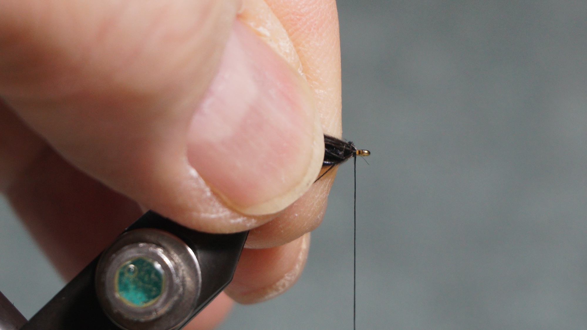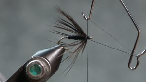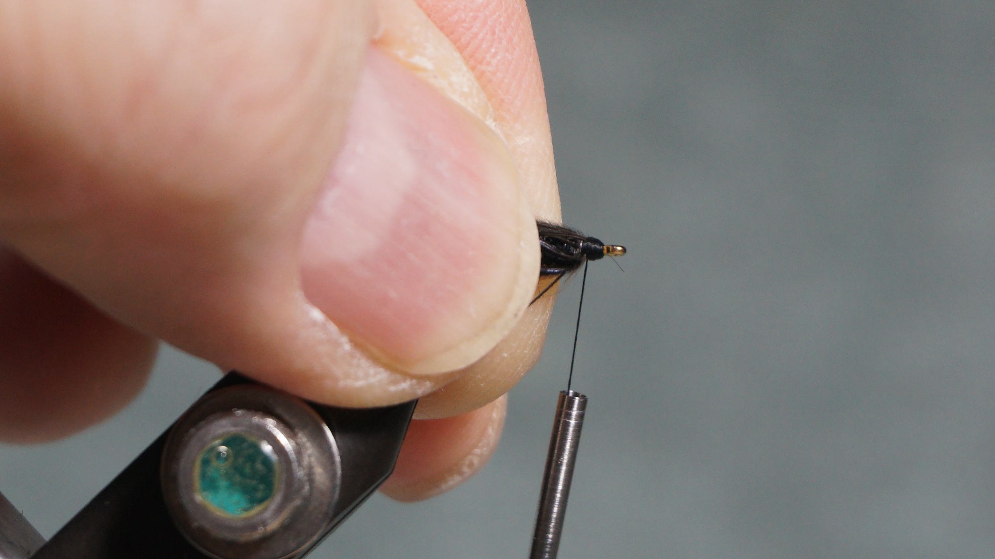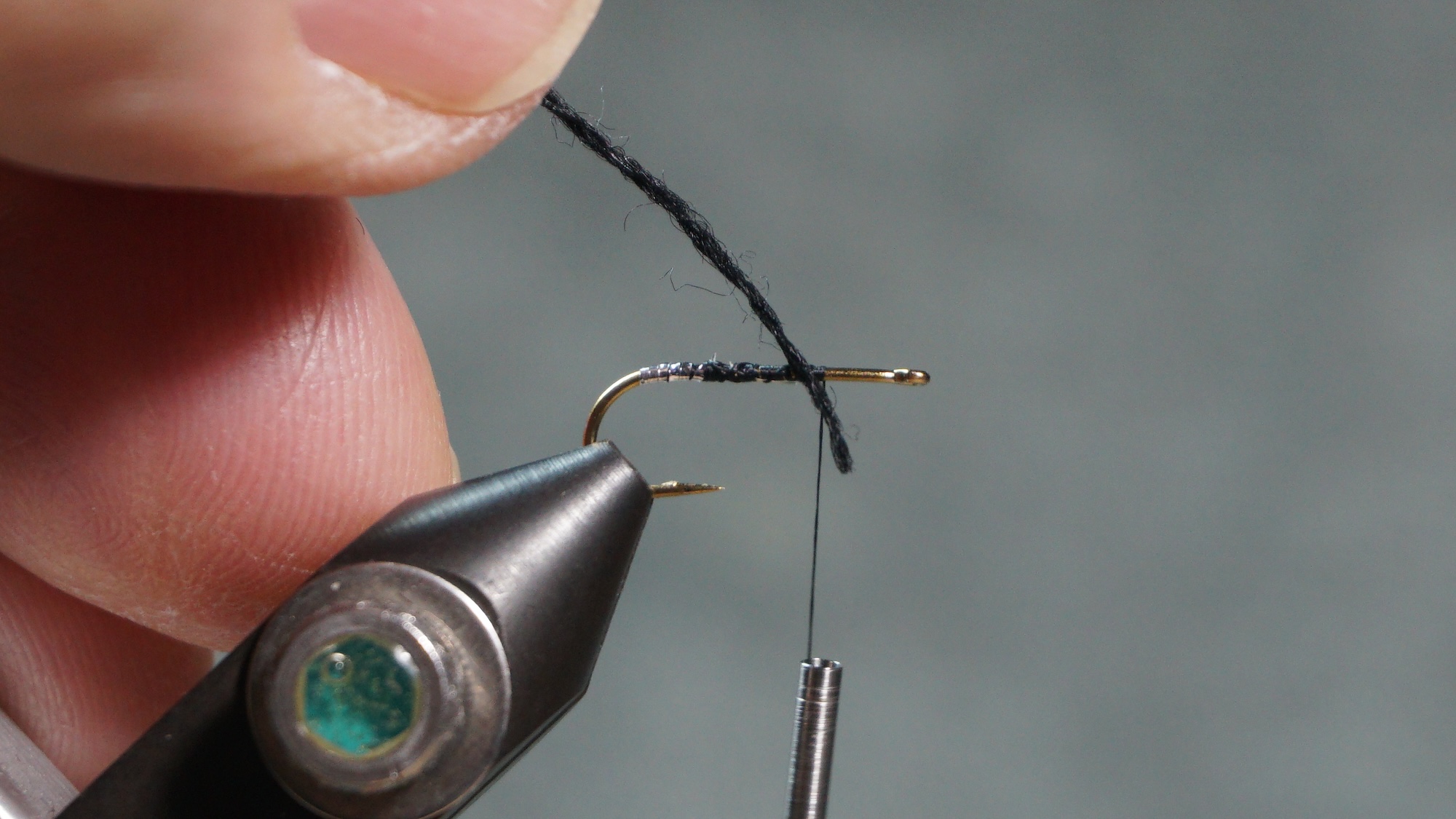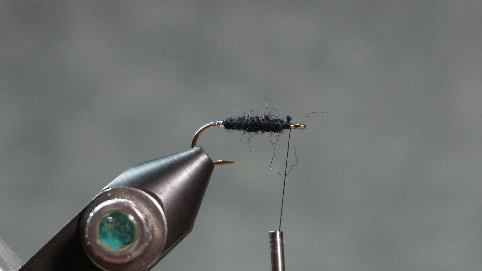 Tie in a strand of black wool or yarn. Wrap the body with the yarn. (or dub a black body) Tie off and clip extra.
