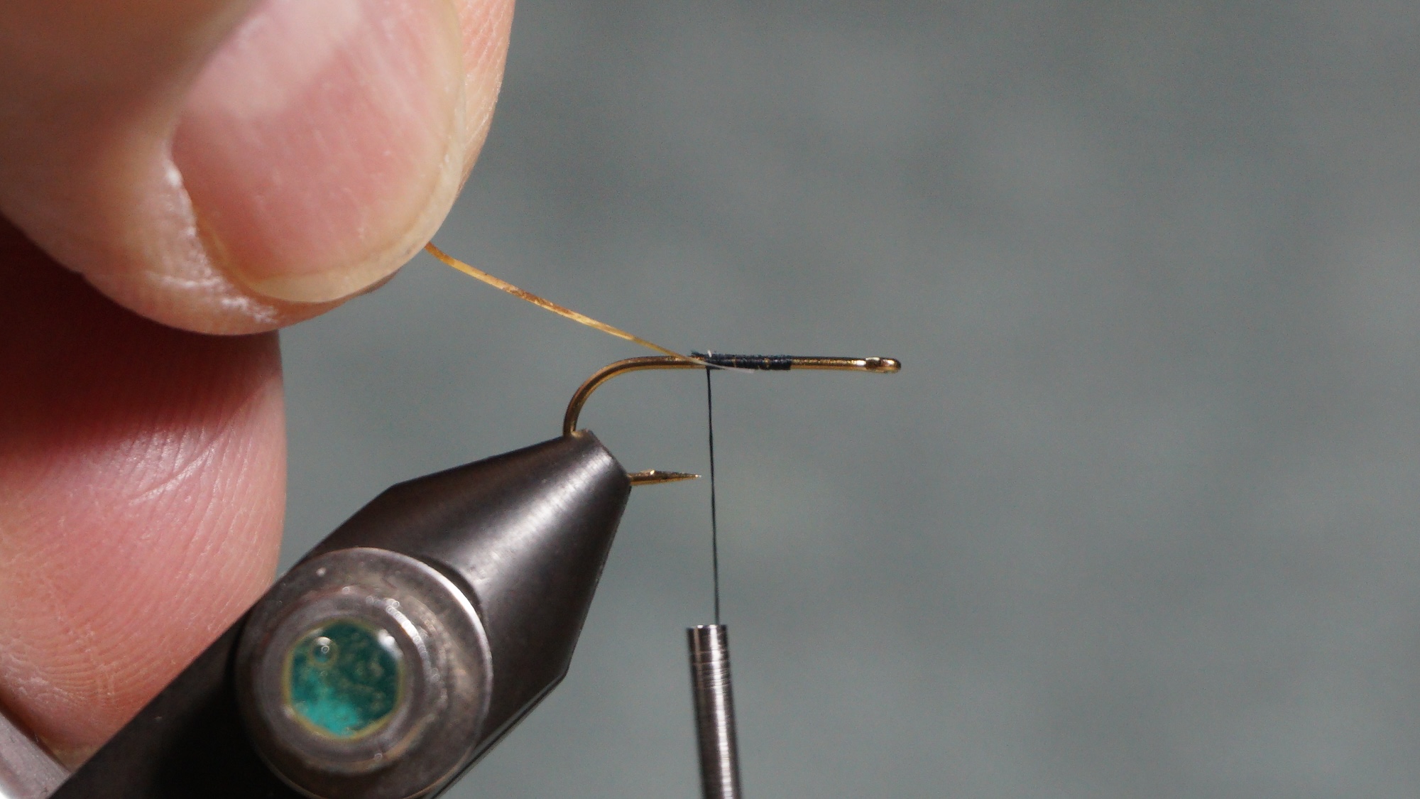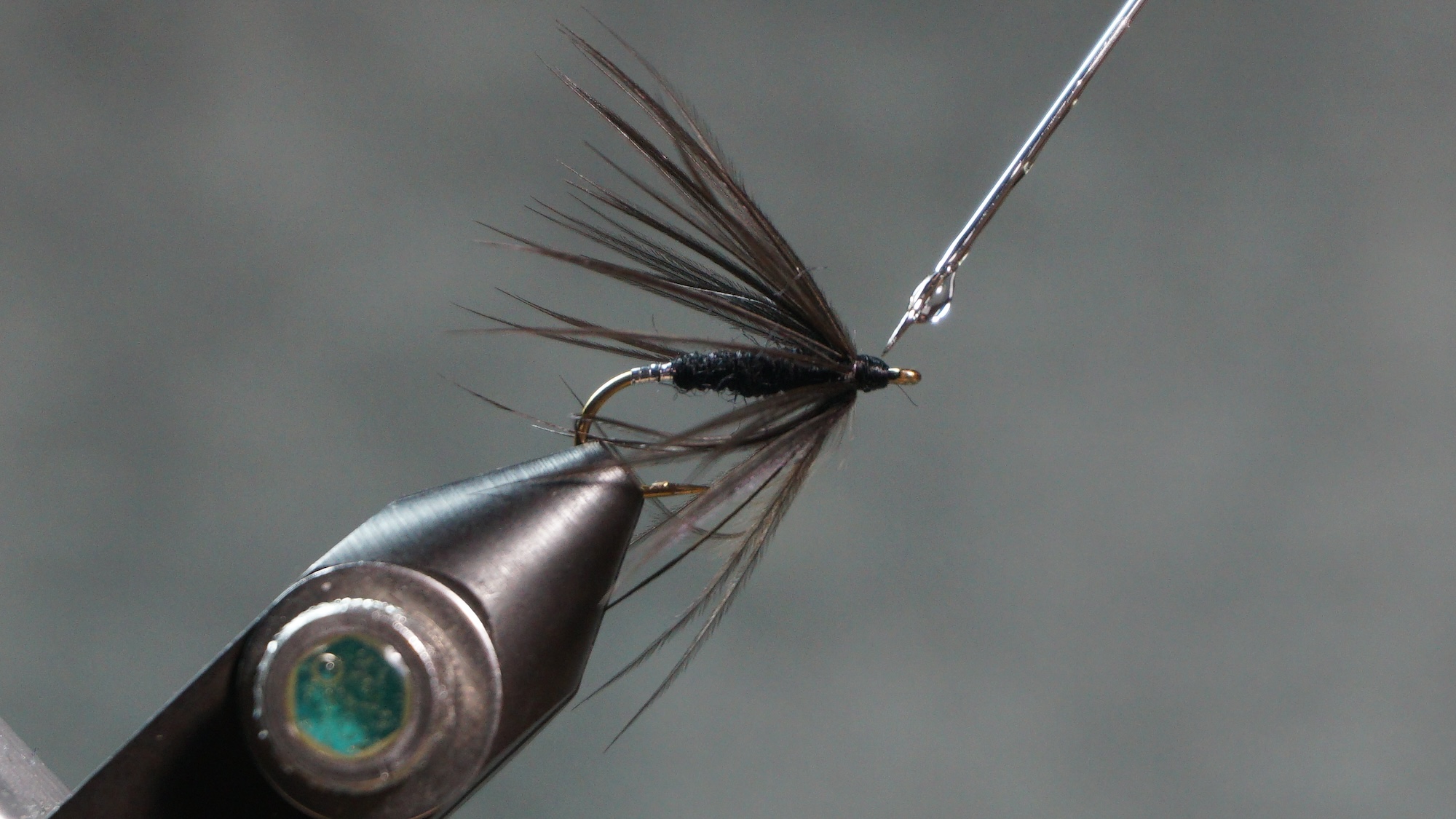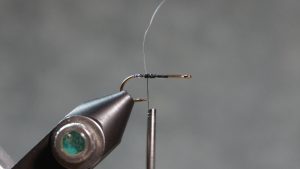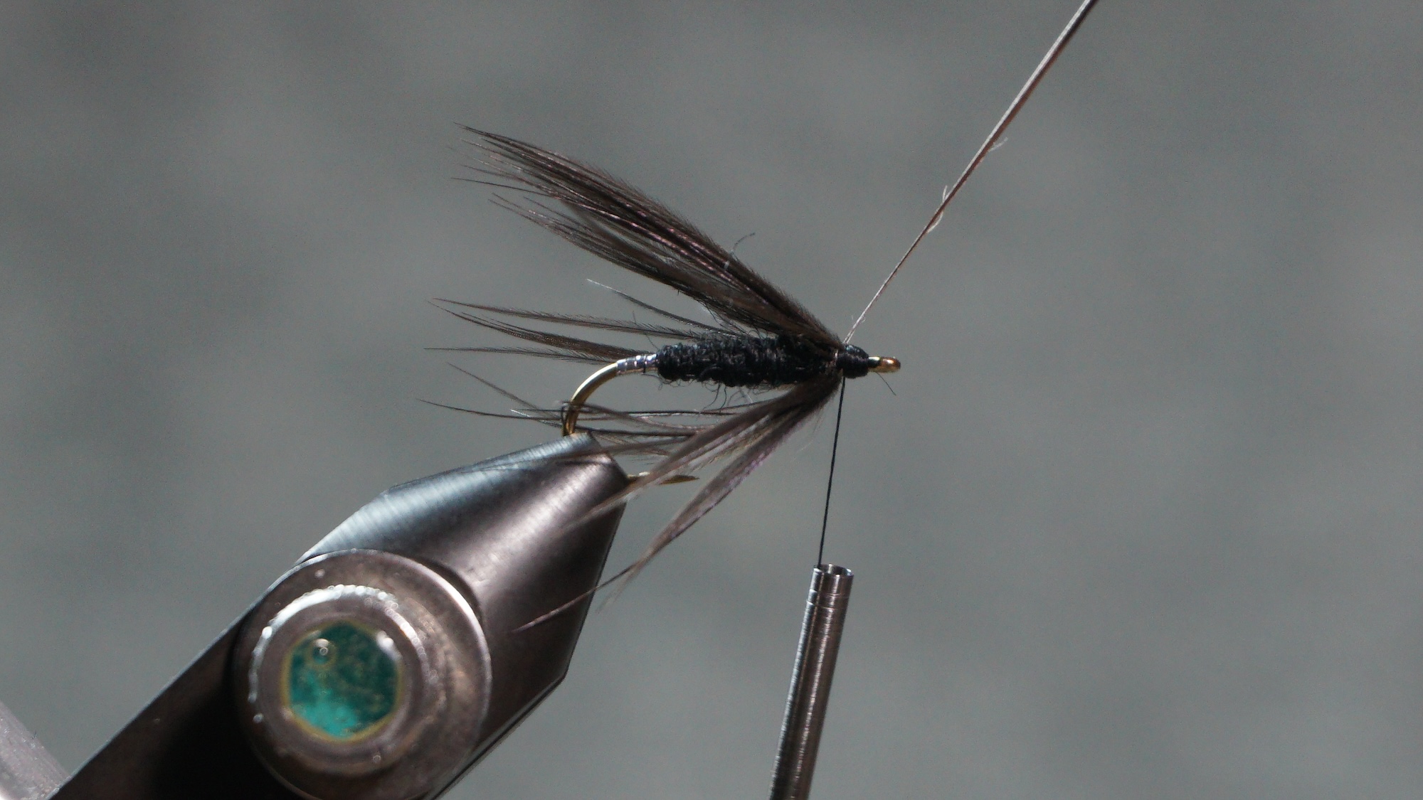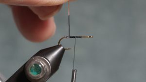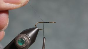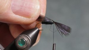 Tie in a strand of black wool or yarn. Wrap the body with the yarn. (or dub a black body) Tie off and clip extra.
