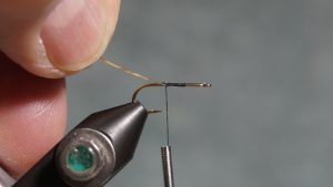 Tie in silver tinsel for the tag. If bi-color tinsel is used, tie in the desired color facing the hook shank. Flip the tinsel as it is wrapped to expose the silver side. Wrap down the bend three or four overlapping wraps, and wrap back up to the body. Tie in, tie off, and clip extra.
