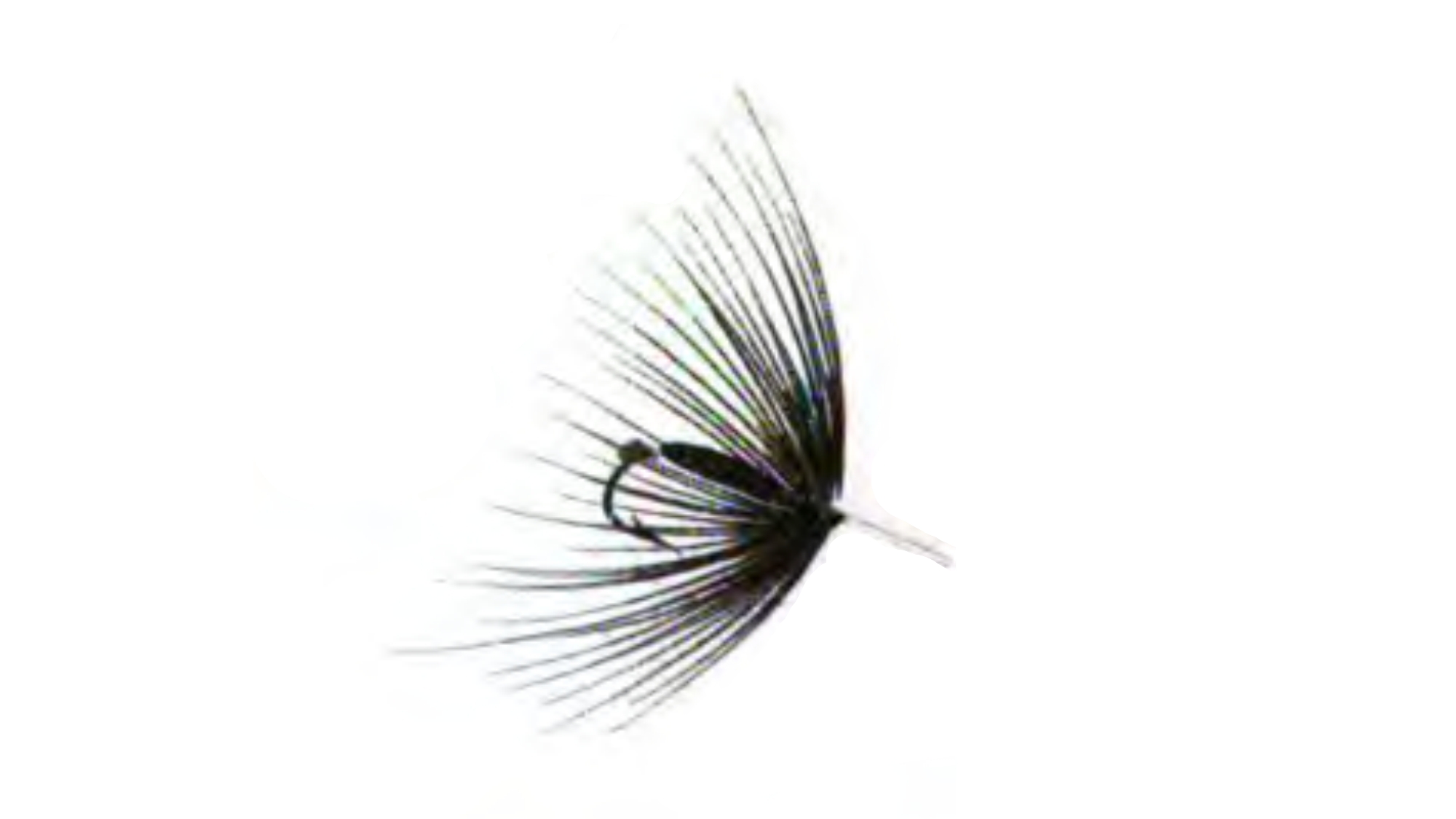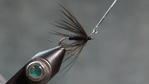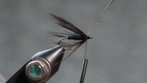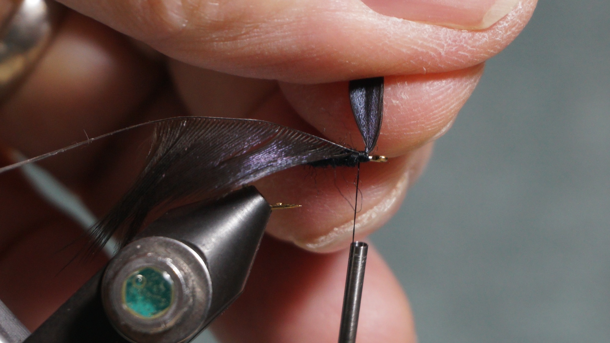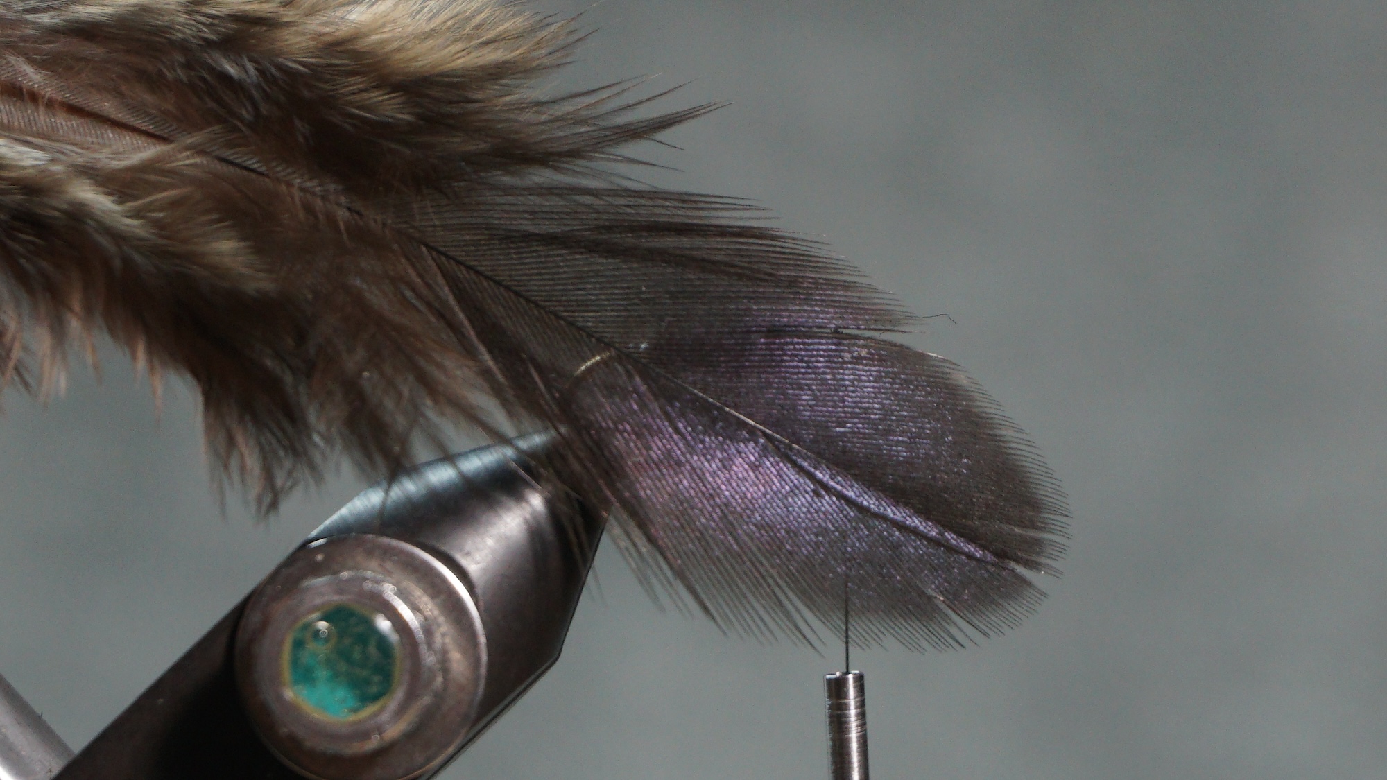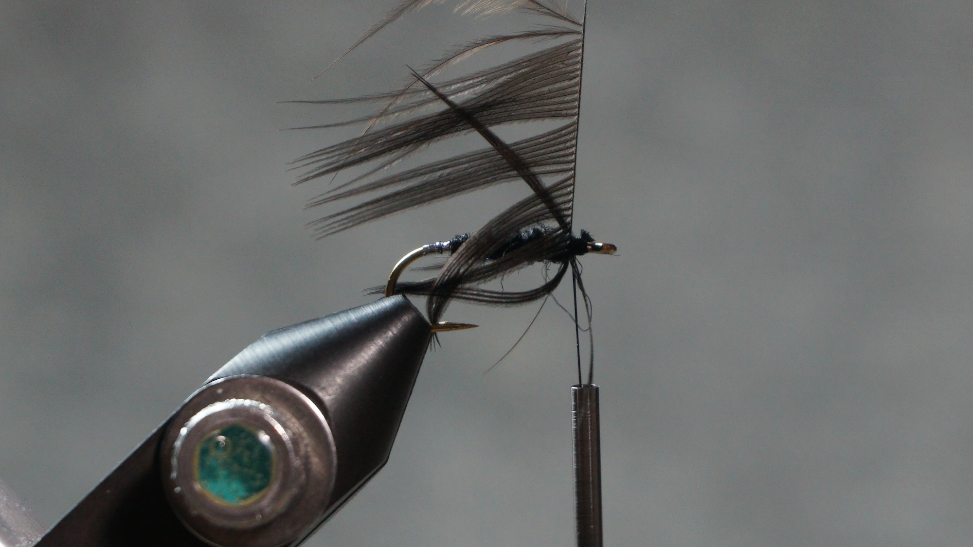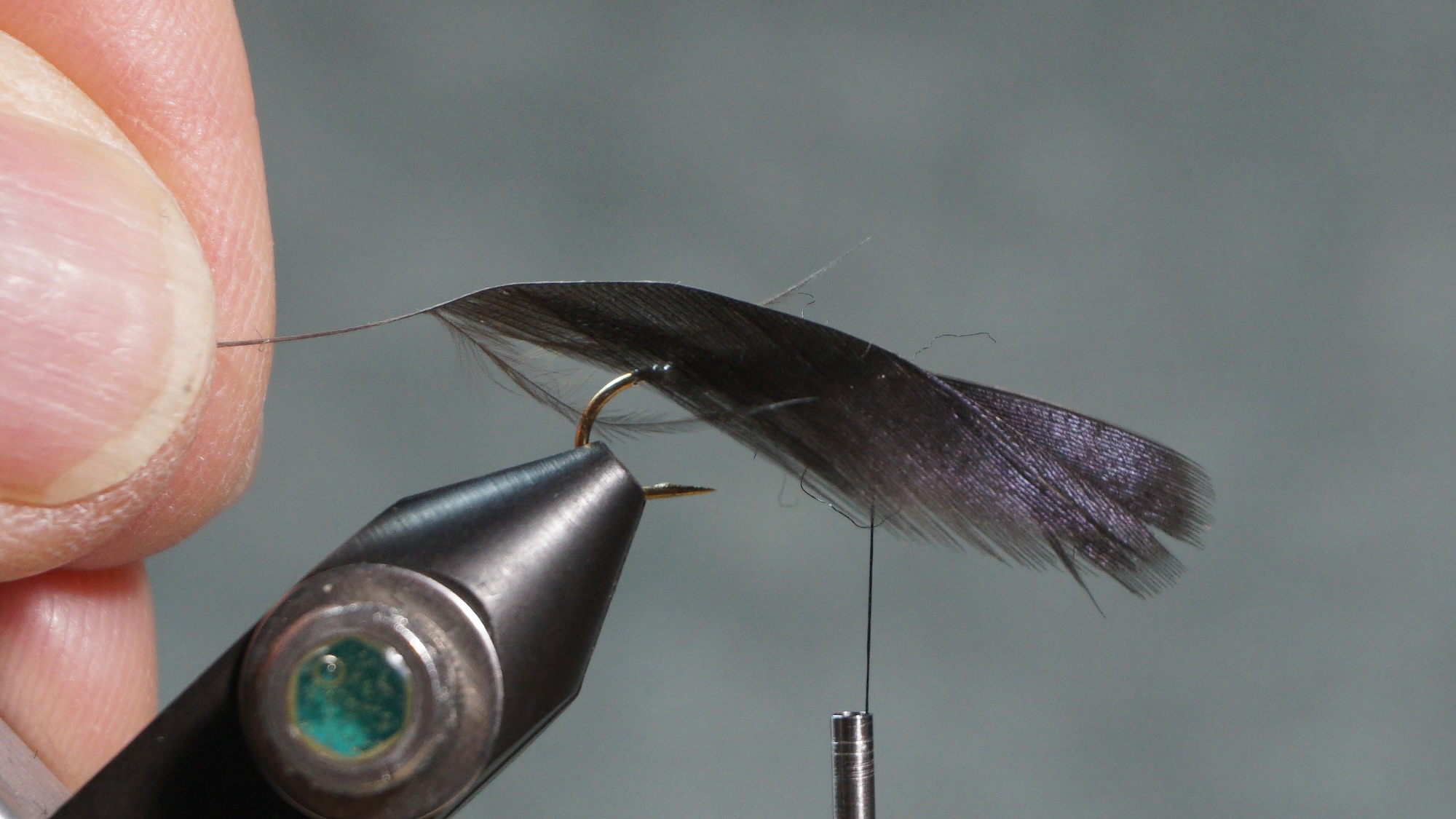 Optional: strip the “top” side of a black hen hackle, doing so can make wrapping the hackle easier.
